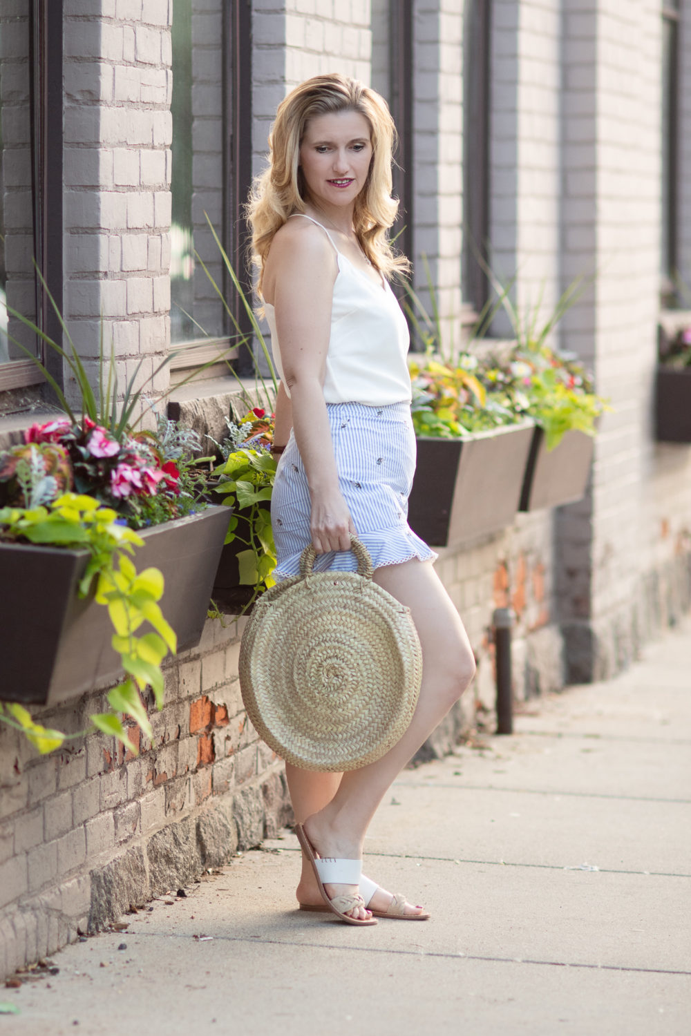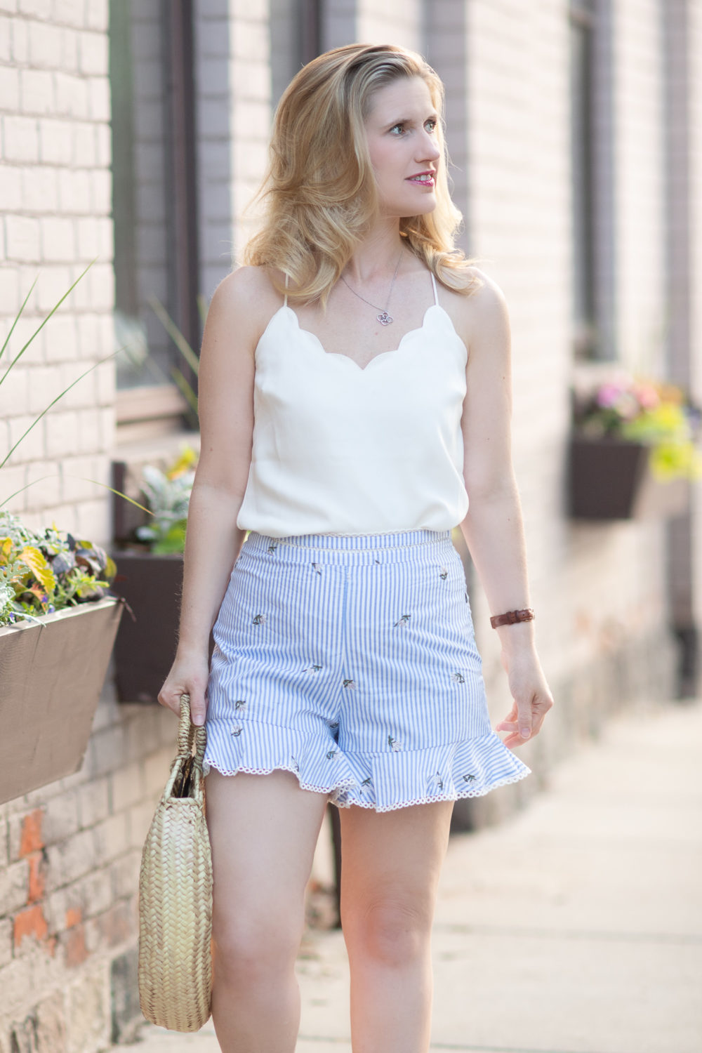 J Crew Factory Scallop Cami | JOA Embroidered Shorts (similar here and here) | Caterina Bertini Straw Circle Tote | Soludos Braided Slide Sandal | Urban Decay Lipstick (Ladyflower)