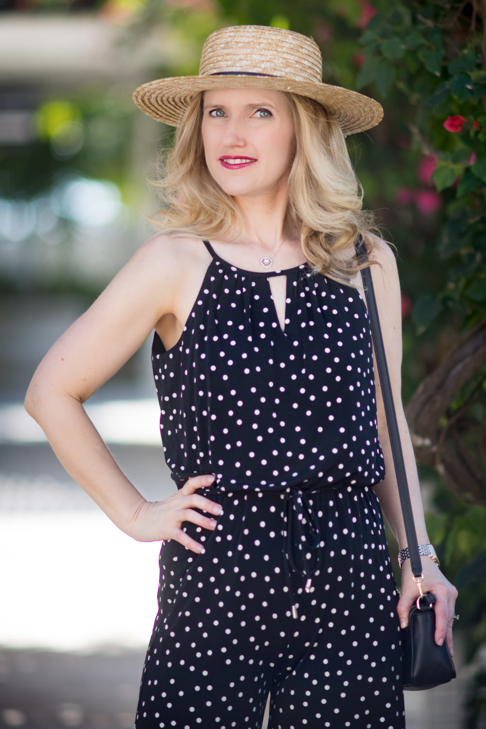 Accessories don’t need to be excessive with this jumpsuit, as it stands out on it’s own. Black block heel sandals and a straw boater hat are perfect for it on a hot and sunny day.
